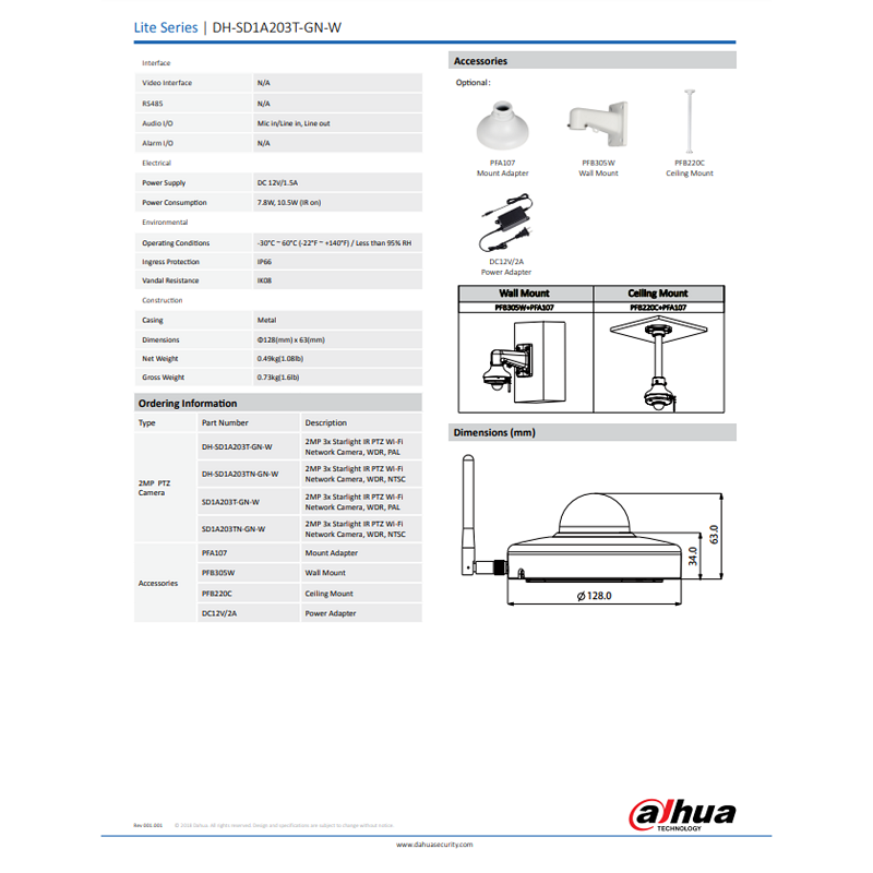 Dahua WIFI 2MP 3x Optical Zoom CCTV Starlight IR PTZ Network IP Camera with SD Slot [Order Model:DH-SD1A203T-GN-W]